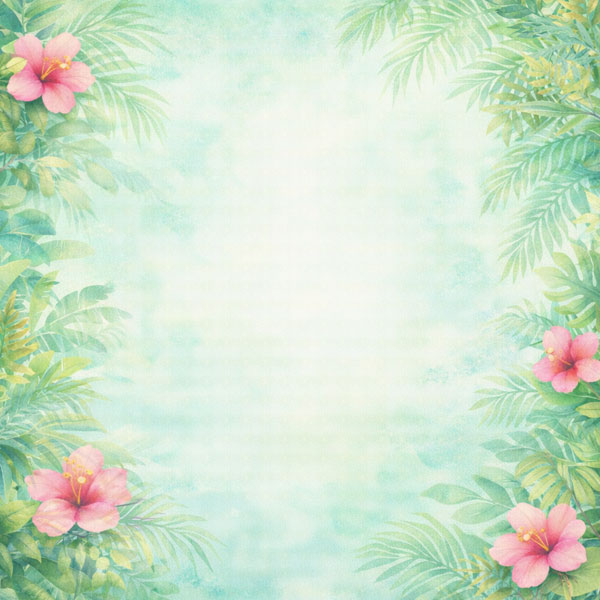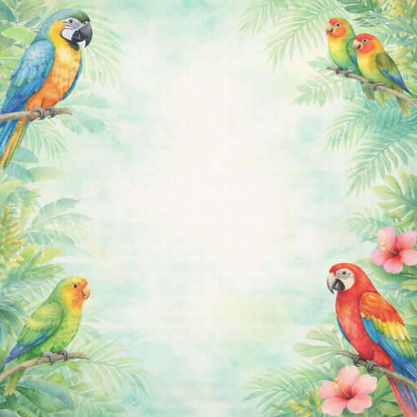 Parrot Safari - Double-Sided Paper 12 x 12. Several watercolor illustrated Parrots sit in a tree branches on the front page. Both sides have a jungle scene background with plumaria.